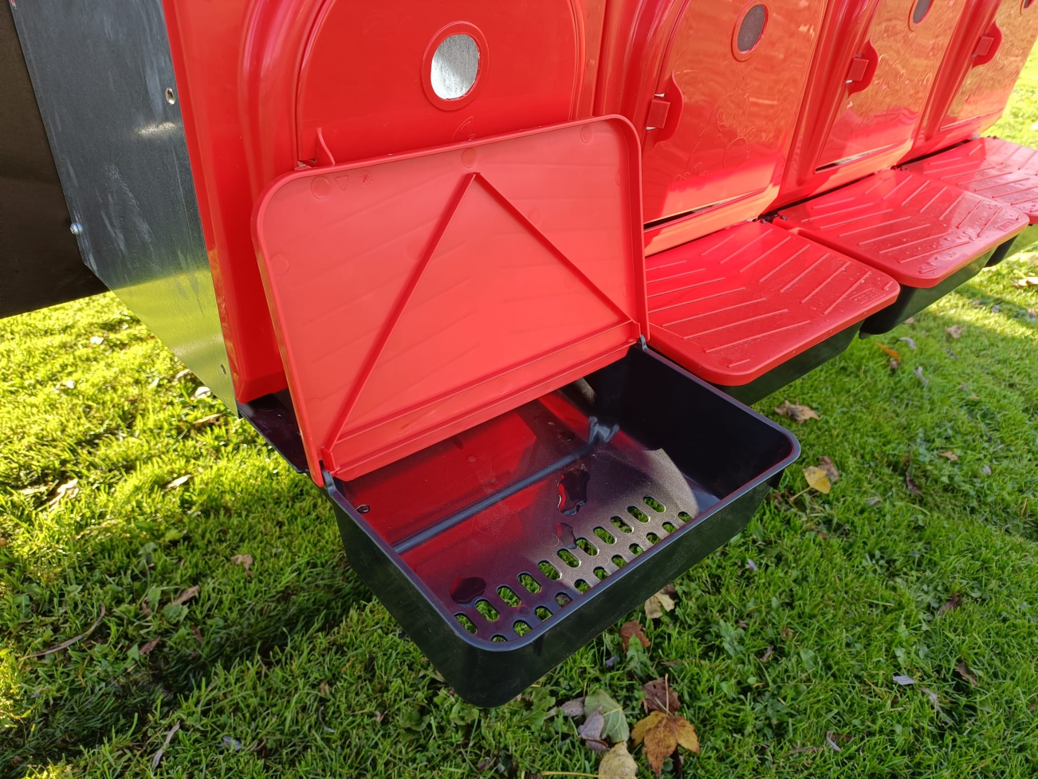 - Uitbreidingen: Trapbak voersysteem, chickenguard voor automatische deuropening, gegalvaniseerde mestopvangplaten.